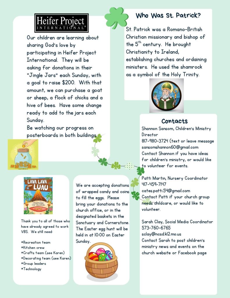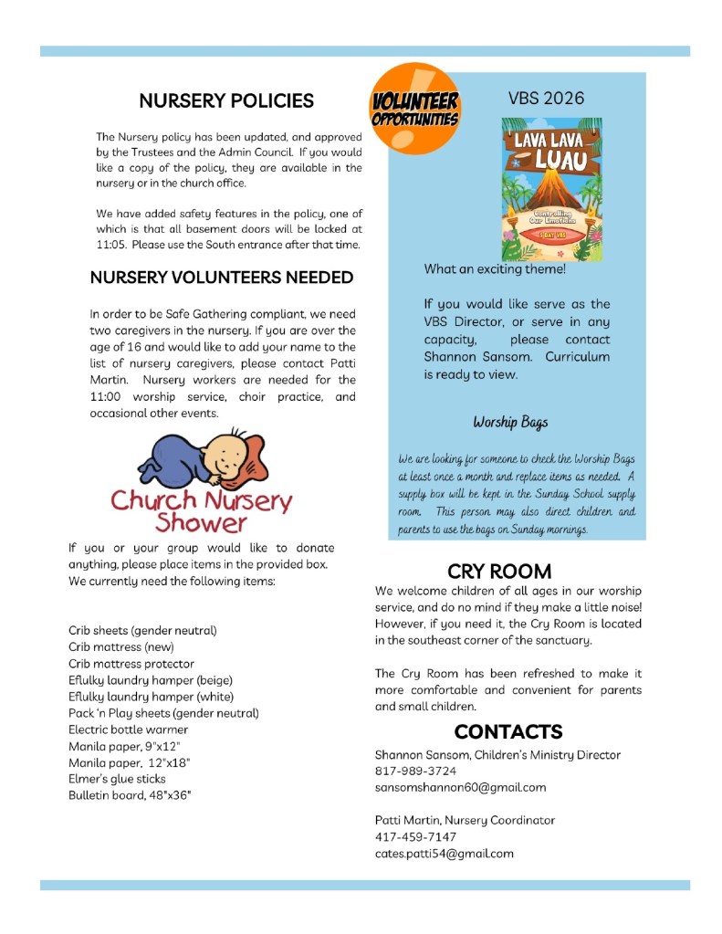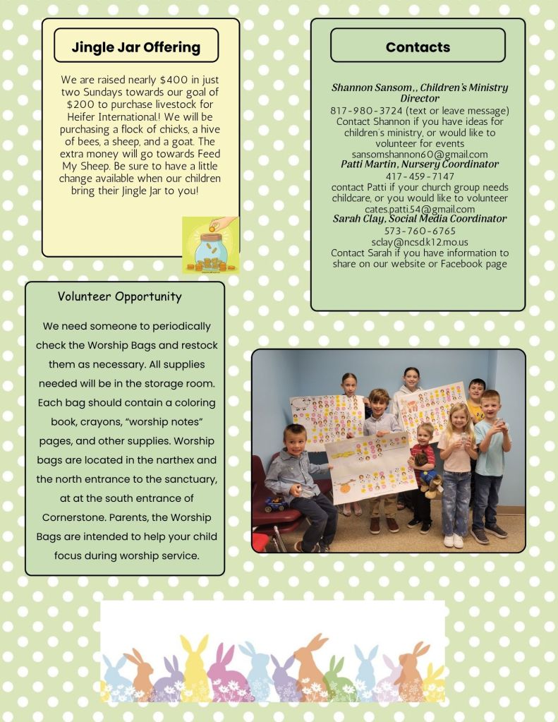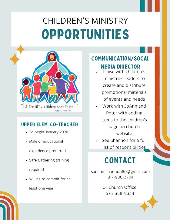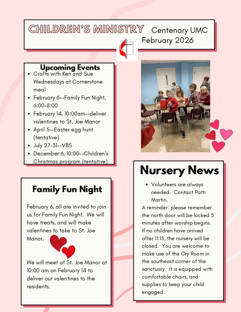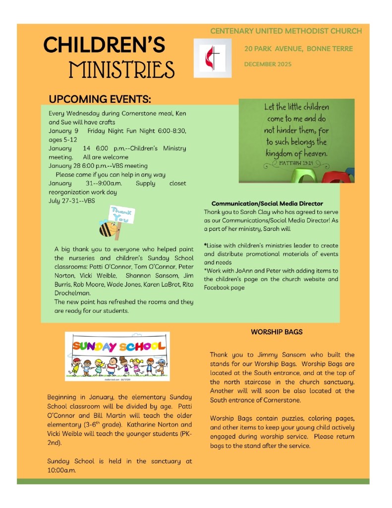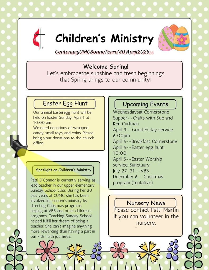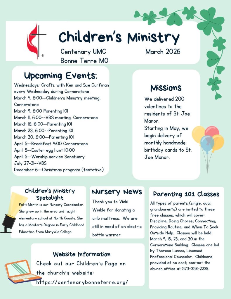 Children’s Ministry is a fun experience at Centenary United Methodist Church in Bonne Terre, designed specifically for kids! We have age-appropriate classrooms and programs for newborns up to 6th grade. Our leaders and volunteers are background-checked and trained so that Children’s Ministry is the safest place for your child to enjoy and learn more about Jesus!